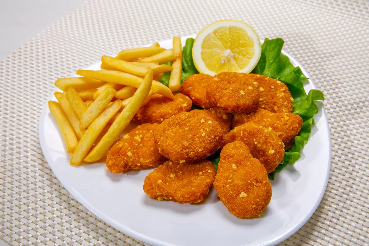 Пържени картофи със сос чедър, пилешки хапки, майонеза