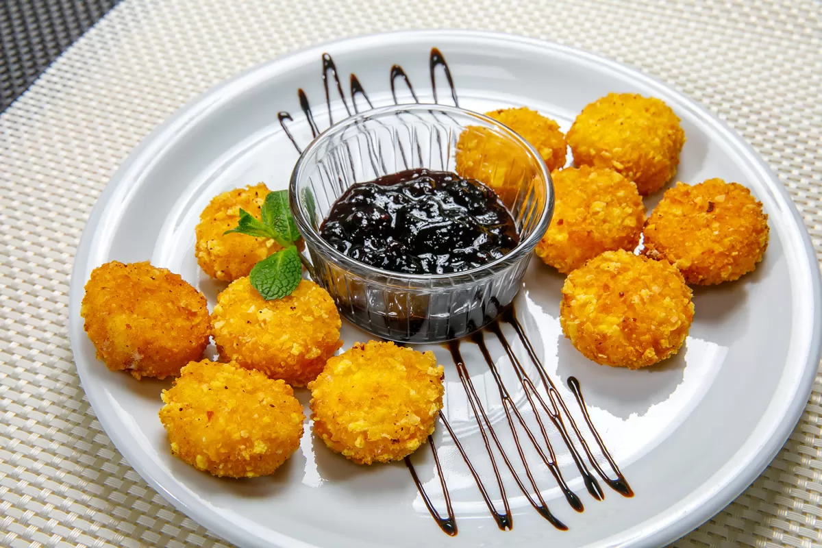 Пържени картофи със сос чедър, пилешки хапки, майонеза
