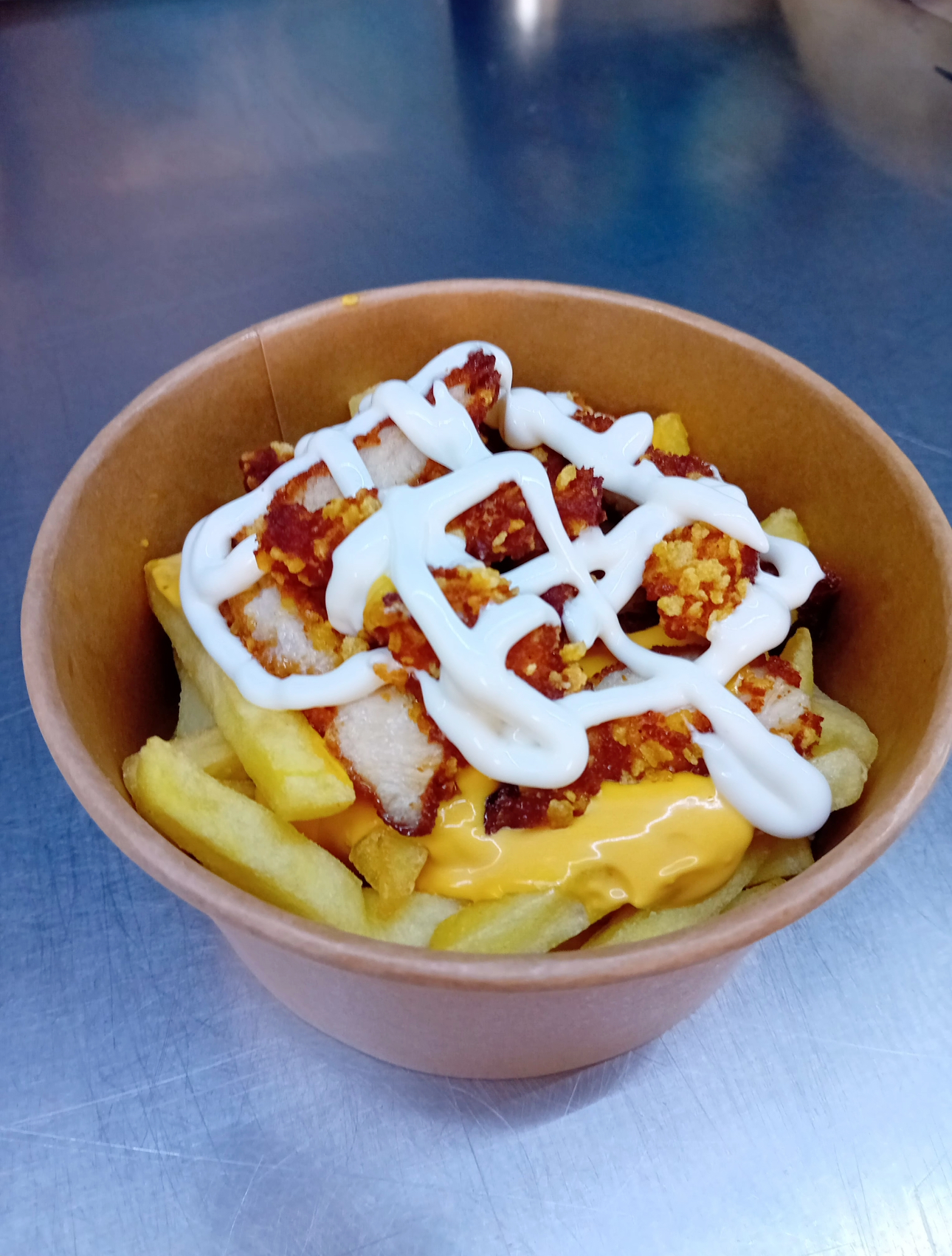 Пържени картофи със сос чедър, пилешки хапки, майонеза